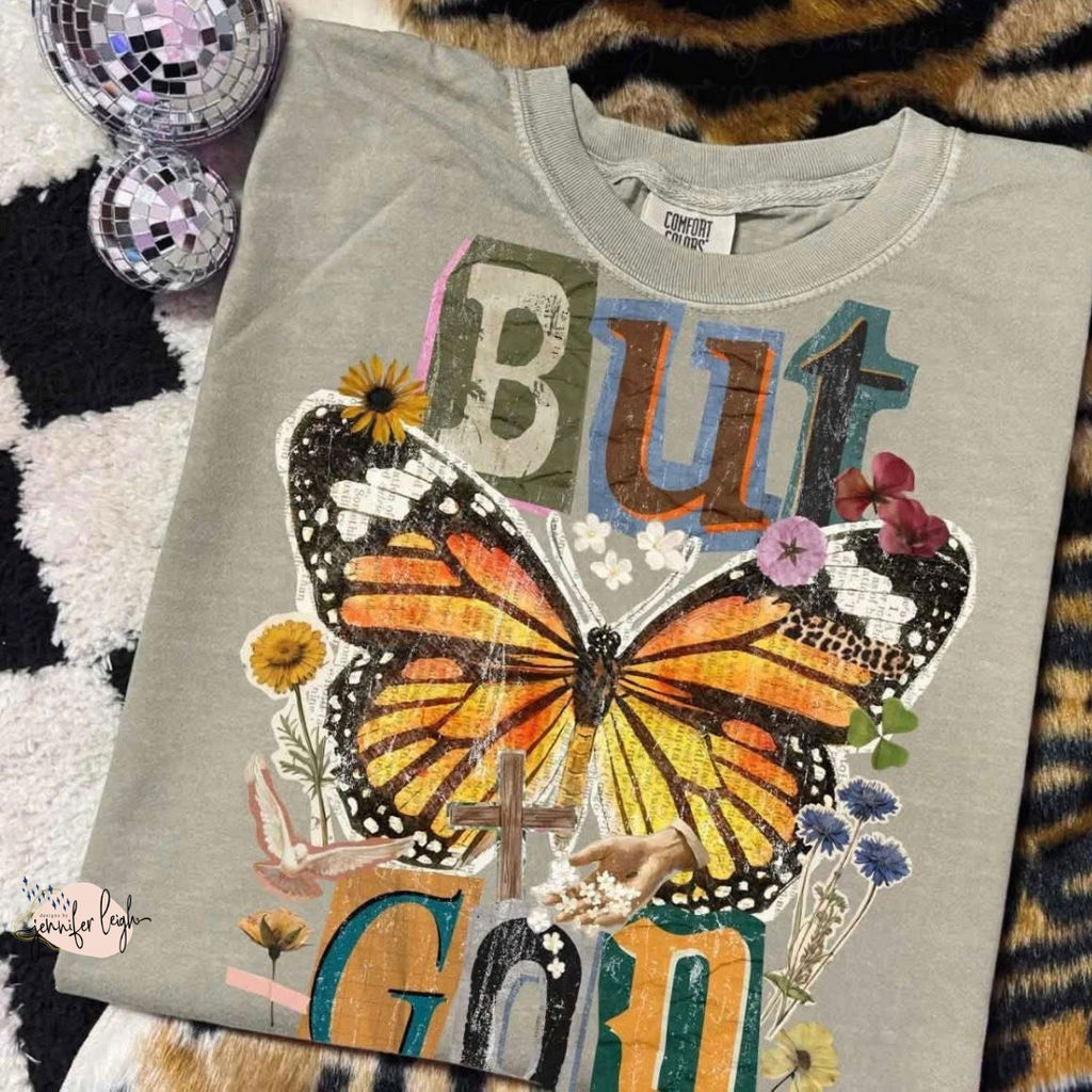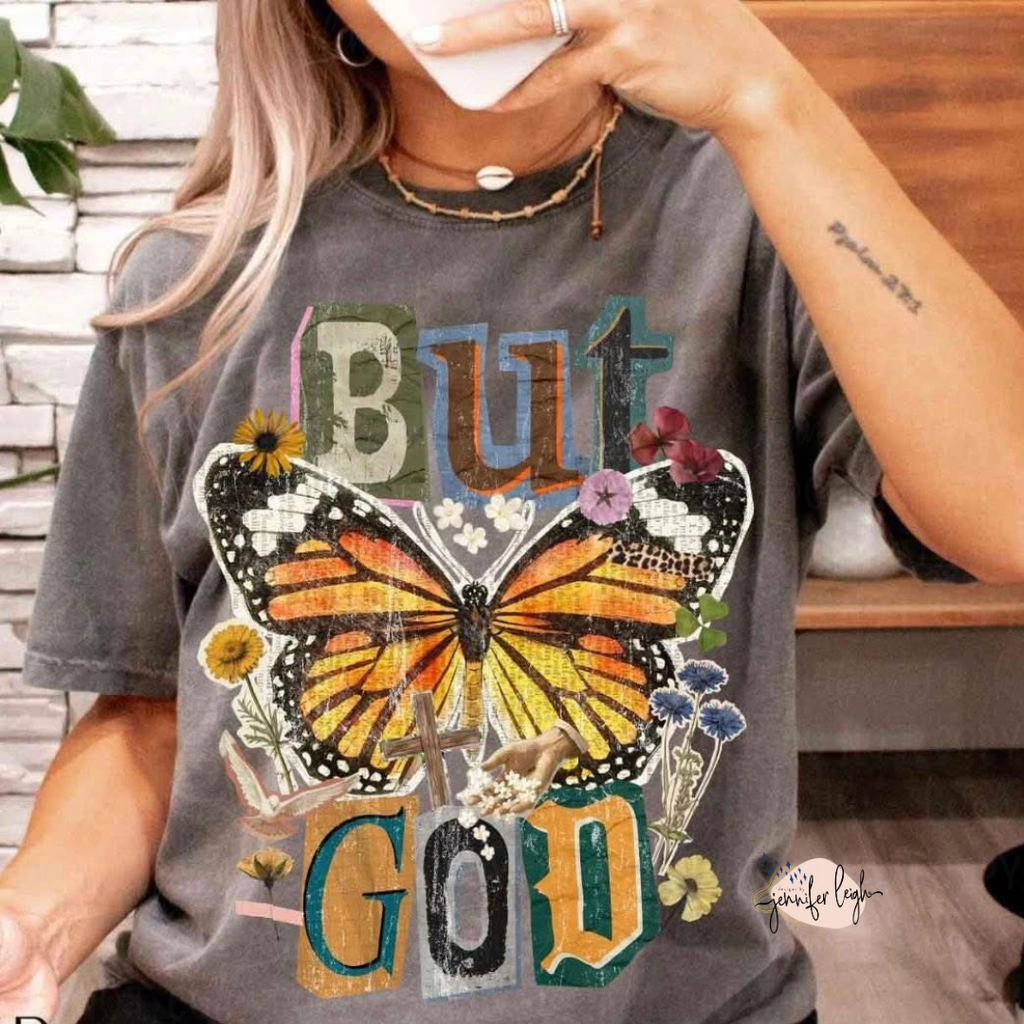This vintage-inspired collage tee features a bold monarch butterfly, layered typography, florals, a cross detail, and soft distressed textures that give it that perfectly worn-in, meaningful feel. It’s a reminder that no matter the circumstance, the story doesn’t end there… But God.