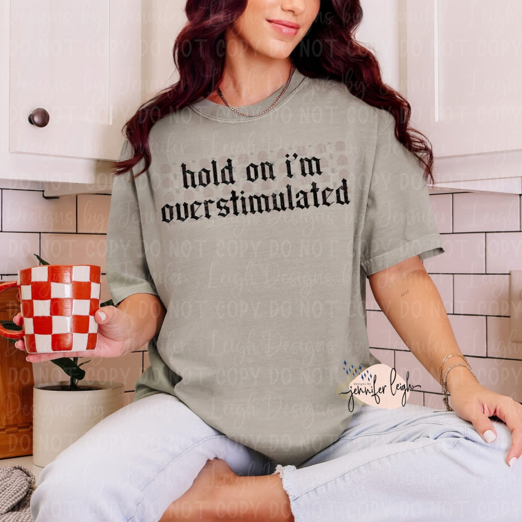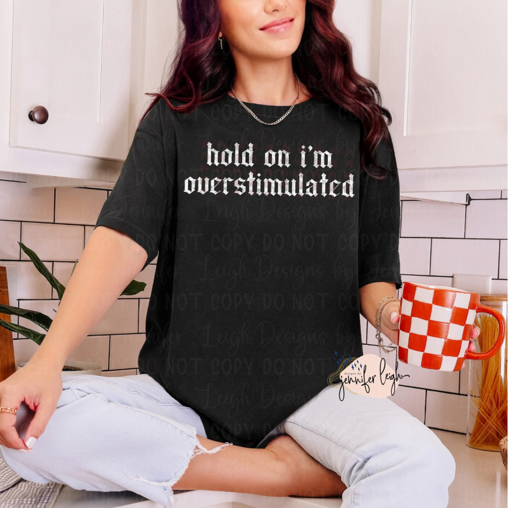 Sometimes life gets loud — this tee says what we’re all thinking. The Hold On I’m Overstimulated shirt features a bold gothic-style font and relatable humor that hits a little too close to home (in the best way).